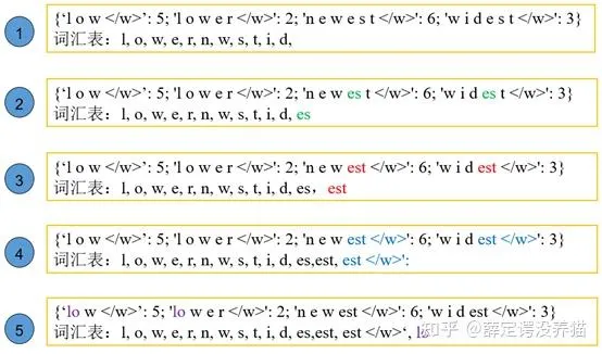 即先将所有单词拆分为字母粒度,例如 l o w : 5,单词low就被分为3个字符,接着再选连续出现频率最高的两个字符,将其合并并且添加到词表中,合并后的字符再后续添加中视为一个字符。例如第三轮添加est,实际上是因为第二轮往词库里加了es之后,将es视为一个整体,再找连续的情况下est出现的概率最高。一直如此循环直到达到设定的词库数目上限为止。