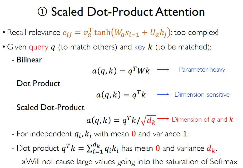 $softmax(\frac{dot(Q,K^T)}{\sqrt{d_k}})V$,$d_k$是词向量维度,假设独立分布的$q_i$,$k_i$均值为0,方差为1,那么$dot(q,v)=\Sigma_{i=1}^{d_k}q_i*k_i$均值为0,方差变为$d_k$,会导致进入softmax的值过于大,故采用scaled Dot-Product Attention除掉$\sqrt{d_k}$